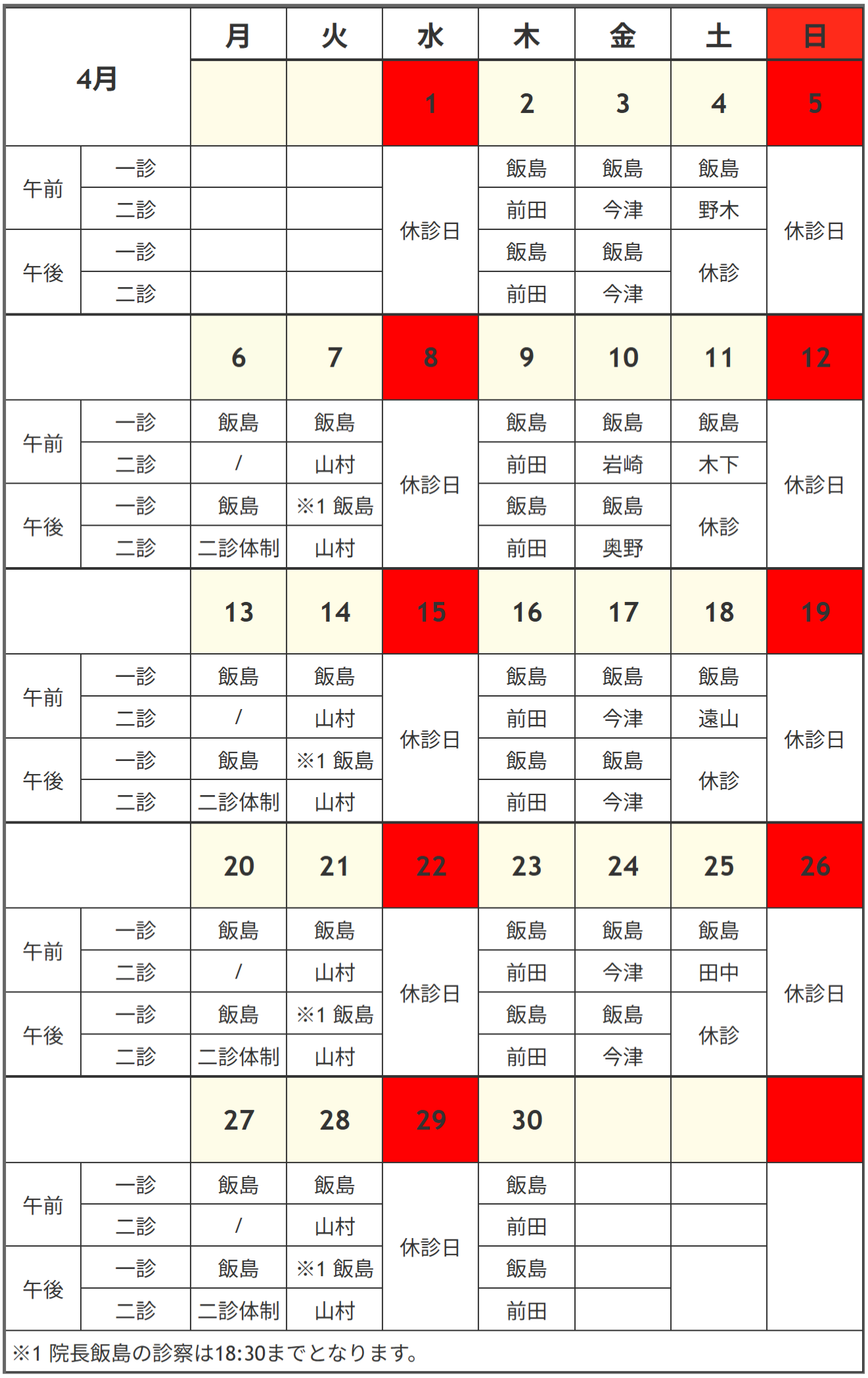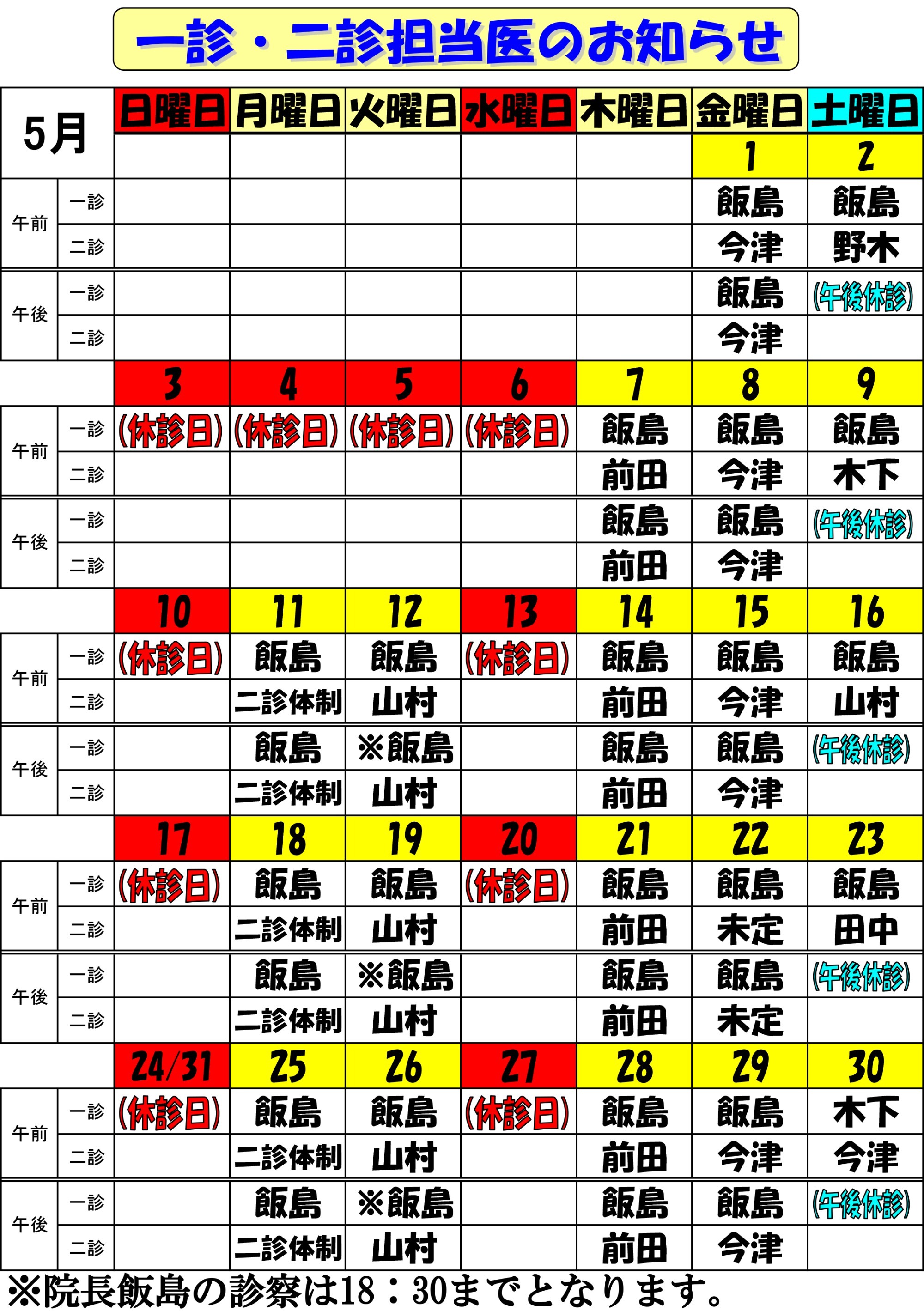 一診・二診 担当医のお知らせ